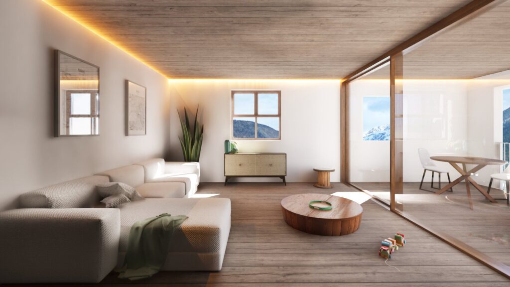 Der weitläufige und einladende Wohnbereich wird durch raumhohe Fensterfronten aufgewertet, die sich zu grosszügigen, lichtdurchfluteten Loggien öffnen. Diese sind als natürliche Erweiterung des Wohnraums konzipiert und bieten einen eindrucksvollen Panoramablick auf die Engadiner Berg- und Tallandschaft.