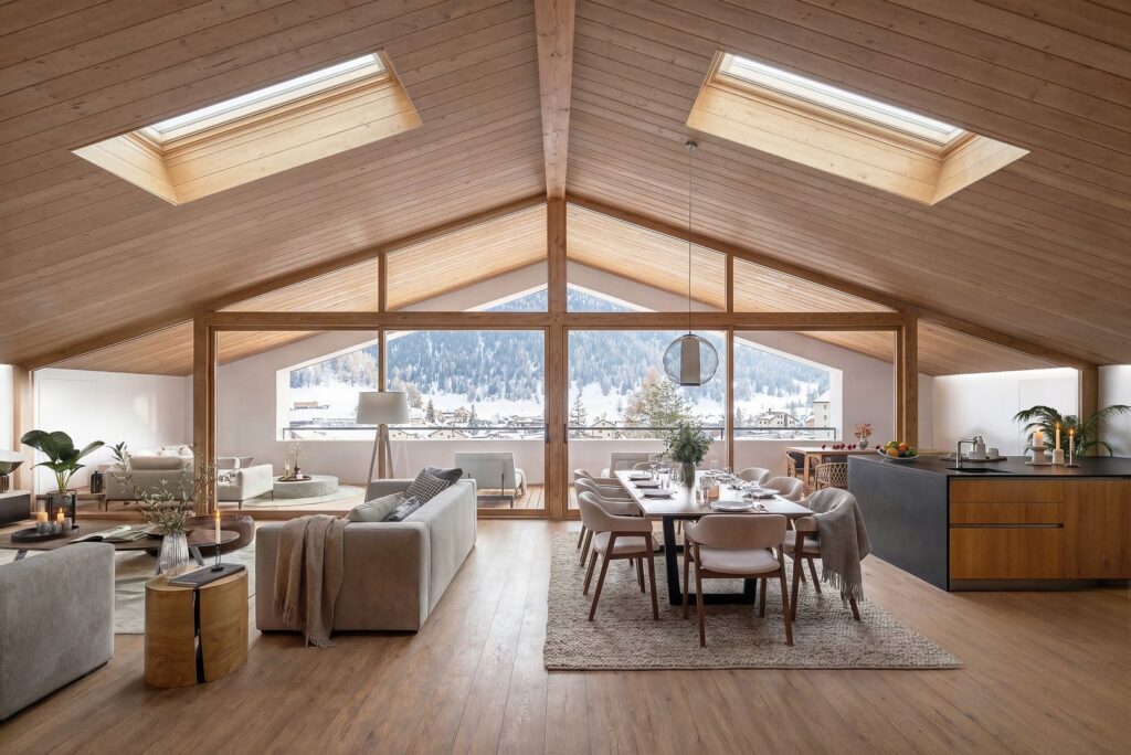 Die grosszügigen, raumhohen Fensterfronten rahmen die alpine Landschaft wie ein sich ständig wandelndes Gemälde ein, holen die Bergwelt ins Innere und verstärken das Gefühl von Weite und Offenheit.