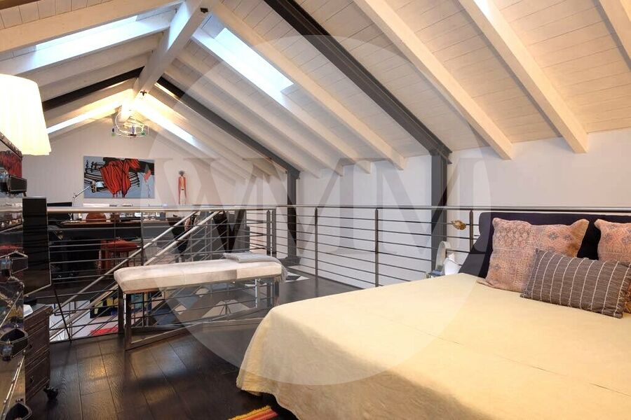 Una scala interna conduce al piano superiore, dove si trova un ampio soppalco aperto, ideale come zona studio o relax, oltre a un locale aggiuntivo con guardaroba e bagno con doccia. Da qui si accede alla terrazza privata sul tetto, perfetta per godersi momenti all’aperto con vista sui tetti e sul verde circostante.