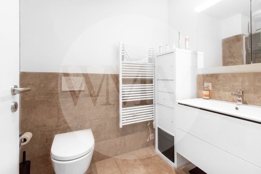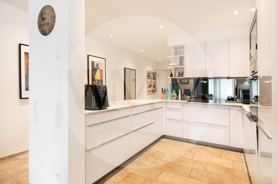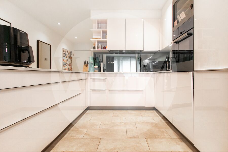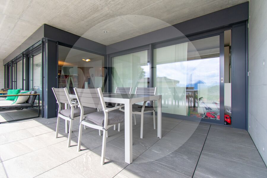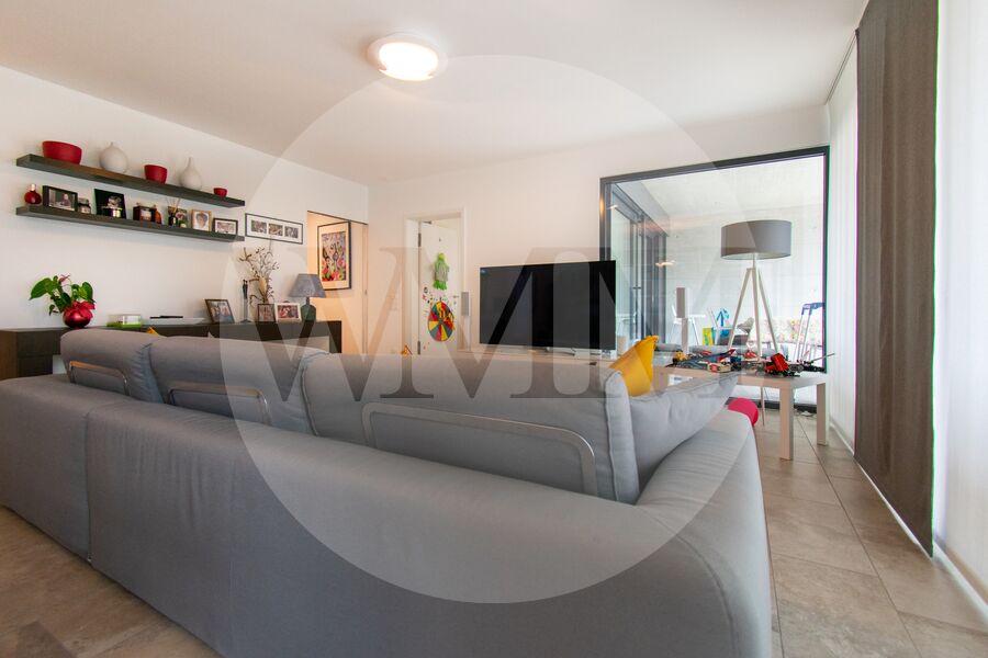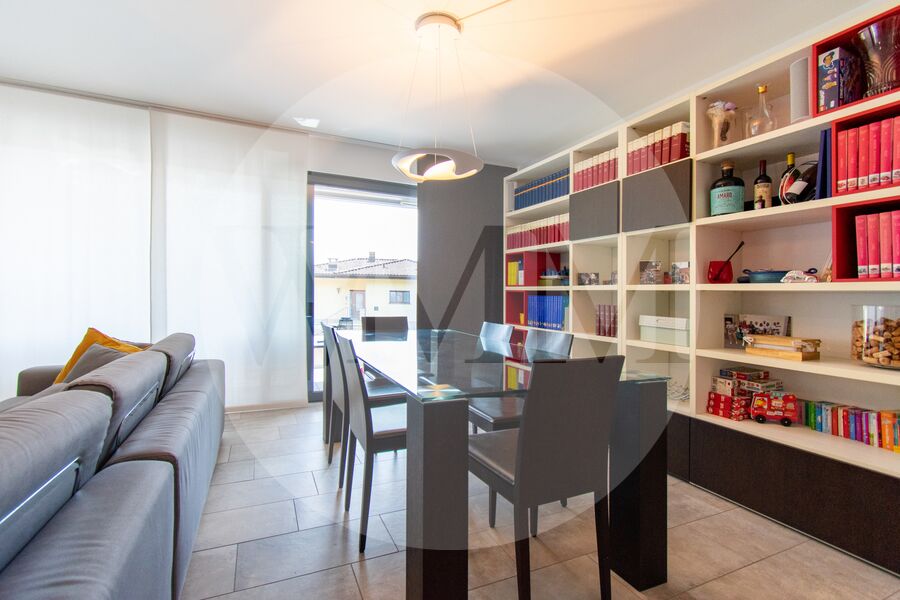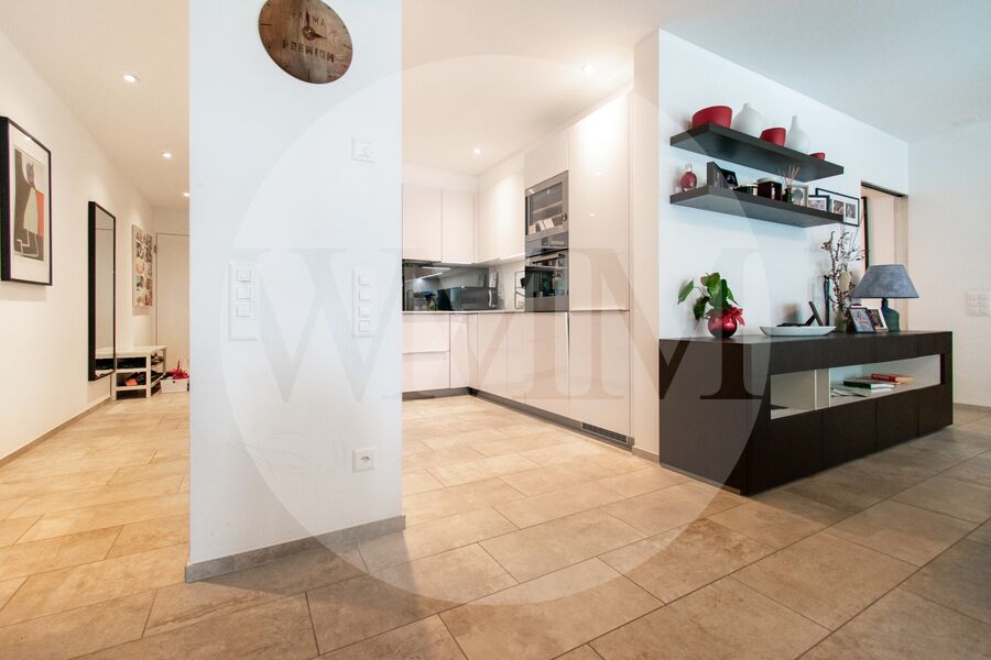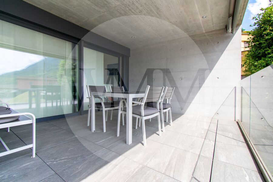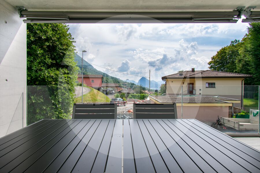 L’abitazione si trova al primo piano di una palazzina recente e ben curata, e si distingue per spazi generosi, grande luminosità e finiture moderne. L’ingresso conduce a un accogliente soggiorno con accesso diretto alla terrazza coperta di circa 28 mq con vista sul paesaggio circostante fino al lago di Lugano. La cucina, a vista e completamente attrezzata, si integra perfettamente con lo stile contemporaneo dell’appartamento.