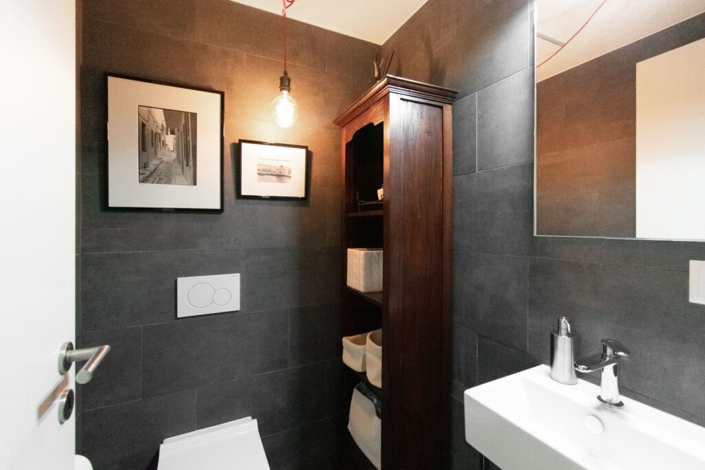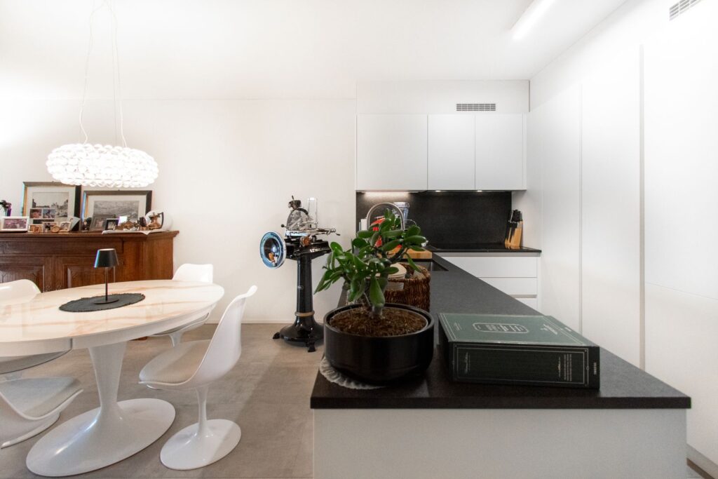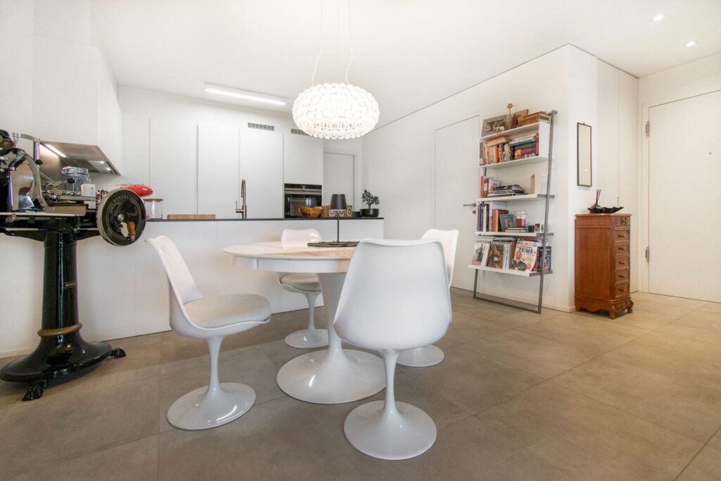 L’unità abitativa, di circa 105 mq abitabili, si apre su un ingresso con pratica armadiatura su misura e conduce a un ampio e luminoso soggiorno con cucina a isola. A disposizione vi sono un bagno di servizio e una comoda lavanderia privata.
