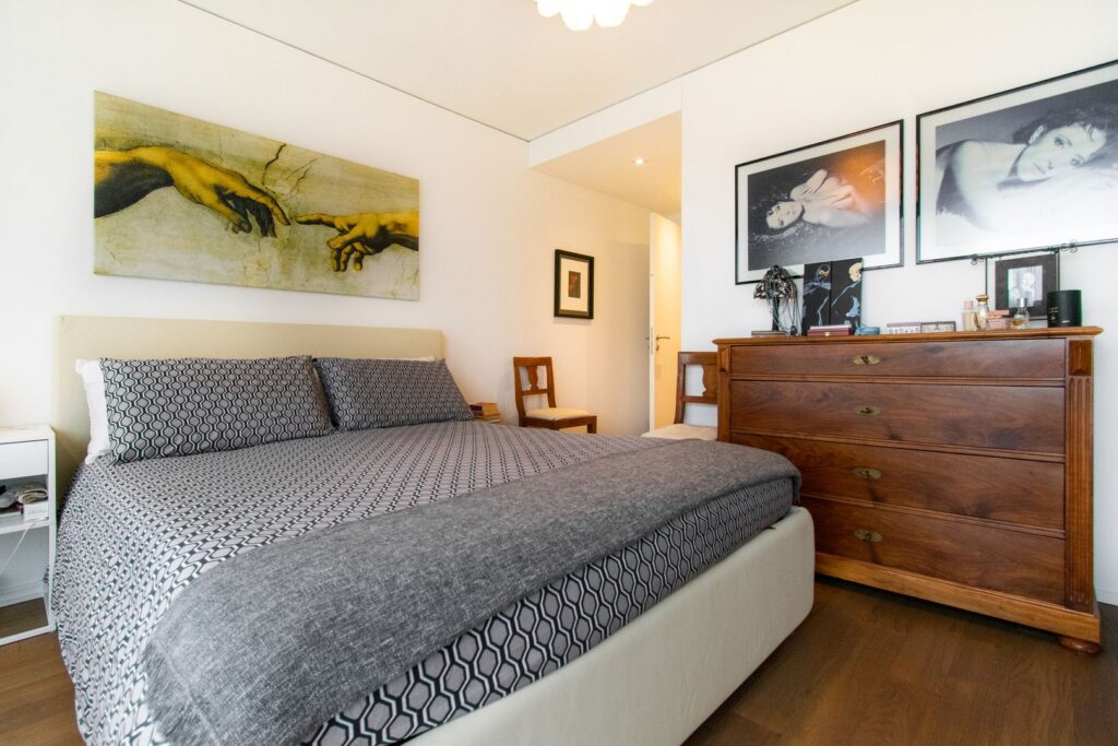 La zona padronale comprende una camera matrimoniale con bagno en suite completo di doccia e accesso diretto all’ampio terrazzo.