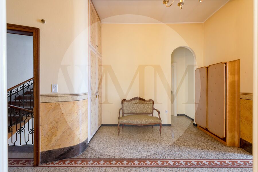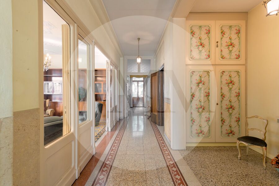 La proprietà che si sviluppa su tre piani, richiede interventi di ristrutturazione e ad oggi si suddivide in due appartamenti pressoché identici, caratterizzati da ampi corridoi, luminosi saloni arricchiti da accoglienti camini, numerose camere, raffinate pavimentazioni in parquet a lisca di pesce o piastrelle decorate.