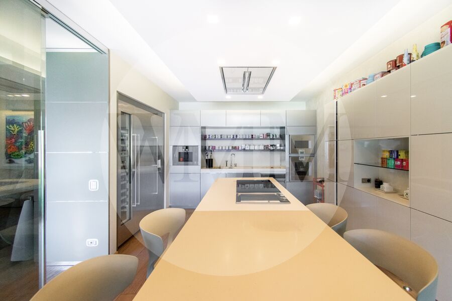 La zona living ospita il soggiorno, l’area pranzo e la cucina di design con isola centrale, dalla quale si accede direttamente all’outdoor panoramico, in naturale continuità con la vista aperta sulla città e sul lago. La piscina si inserisce con equilibrio in questo contesto, completando l’area esterna e rafforzando il carattere esclusivo della proprietà.