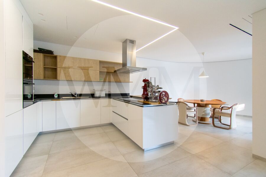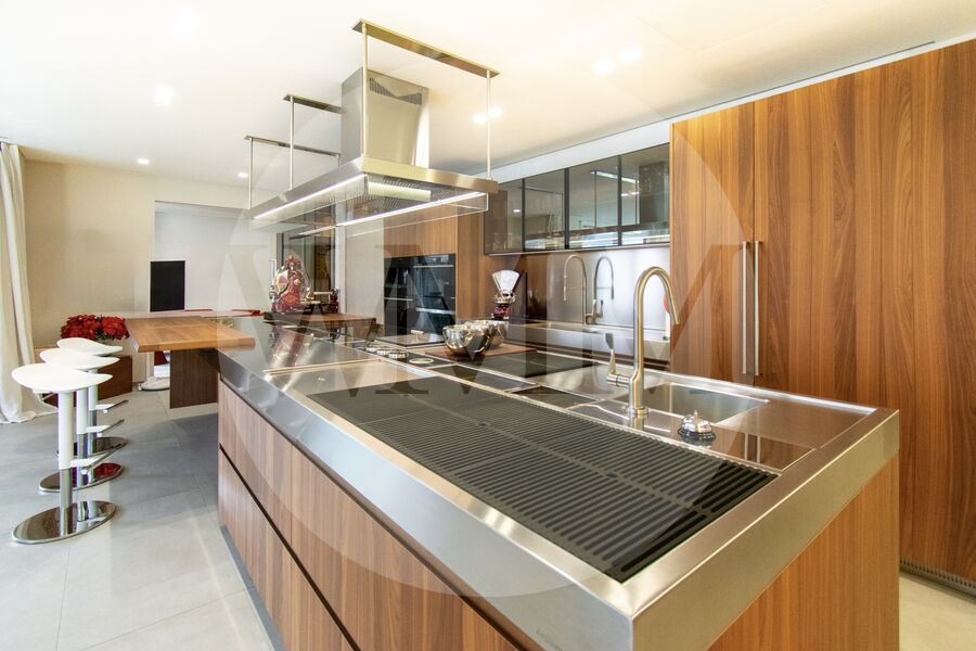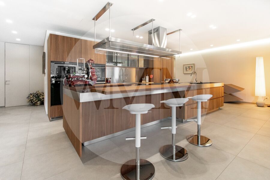 La cucina moderna e completamente attrezzata, concepita come vero fulcro della zona giorno, si distingue per linee pulite, materiali di qualità e massima funzionalità, diventando protagonista della scena abitativa. Accanto alla cucina trovano spazio una raffinata sala da pranzo e una cantina vini, elementi che arricchiscono l’esperienza abitativa con stile e funzionalità.