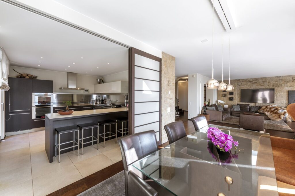 Luminosissimo grazie all’esposizione verso sud e alle grandi vetrate panoramiche, ha una superficie commerciale di circa 265 mq e si sviluppa su due piani.