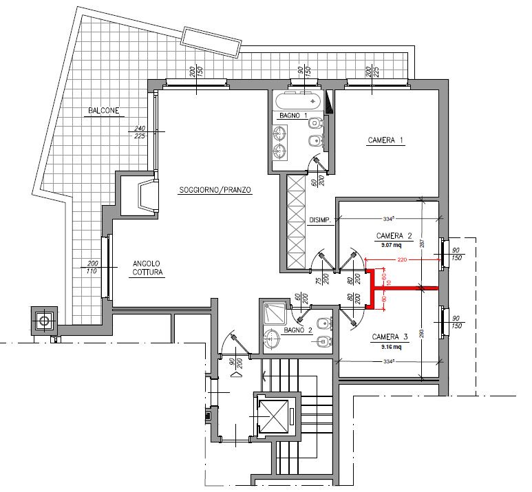 Questo trilocale si compone di: ampio e luminoso soggiorno con grandi vetrate e camino, cucina separata e attrezzata, grande terrazza con barbecue, 3 camere da letto, 2 servizi: uno con vasca da bagno e finestra ed uno con doccia e predisposizione per lavatrice.